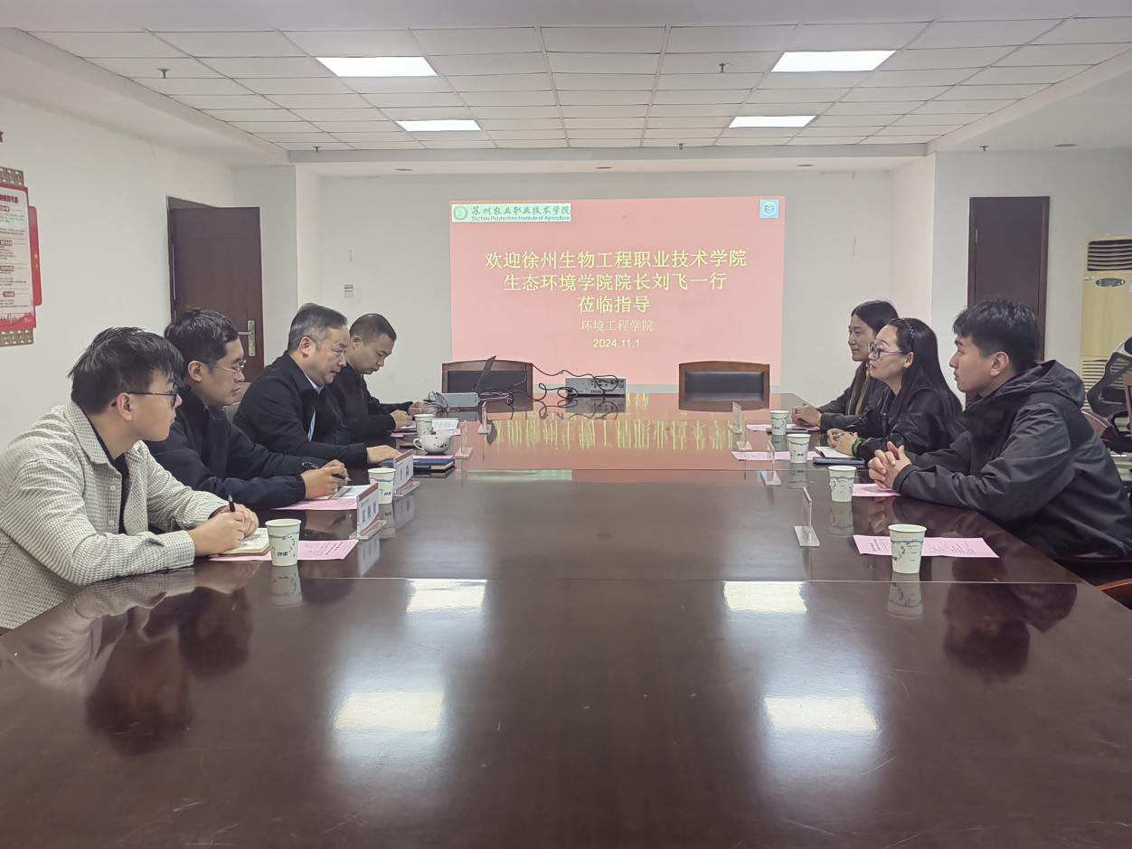 刘飞院长简要介绍了徐州生物工程职业技术学院的基本情况,并重点介绍了生态环境学院的办学历程、师资队伍和专业设置情况。她表示,希望通过此次交流,摸索新专业的发展方向。宣雄智副院长详细介绍了苏州农业职业技术学院环境工程学院概况,教研室主任于淼进一步对生态环境修复技术专业的发展历程、课程设置、实验实训及就业情况作详细介绍,并表示该专业面向当前环境治理领域的研究热点和前沿动态,具有广阔的发展前景和市场需要。随后,教研室主任裴俊贤与我院领导和教师分享了2024年国赛的参赛经验,现场交流气氛热烈。